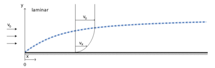 Bei einer ebenen Platte wie im Bild nimmt die Grenzschichtdicke mit der Wurzel des Abstands zur Plattenvorderkante zu:
