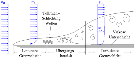 Nach einer bestimmten Lauflänge entlang einer Platte wird die Grenzschicht instabil und schlägt in den turbulenten Zustand um, siehe unten. Das geschieht bei der kritischen Reynolds-Zahl