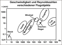 Das Diagramm rechts vergleicht Geschwindigkeiten und zugehörige Reynolds-Zahlen der Strömungen um einige Flugobjekte. Beispielsweise sind die Reynolds-Zahlen von Luftschiffen höher als die von Flugzeugen. Sie bewegen sich zwar mit geringerer Geschwindigkeit, sind aber deutlich größer.