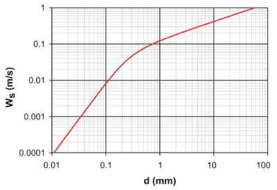 - für hohe Sedimentationsgeschwindigkeiten bzw. Reynolds-Zahlen (1000 < Re < 200.000, Newton-Bereich) gilt CD=0,44 (für Kugeln). In diesem Fall ändert sich die Sedimentationsgeschwindigkeit mit der Wurzel des Partikelradius bzw. des Äquivalentdurchmessers, siehe Formel oben. Es liegt eine turbulente Strömung vor.