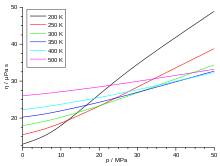 - ↑ Bei Polymeren gibt es einen sehr breiten Bereich an Viskositäten, der im Wesentlichen von der Kettenlänge und deren Verzweigungsstruktur, aber auch von der Schergeschwindigkeit abhängt, da sie Strukturviskosität aufweisen. Es ist deshalb nicht sinnvoll, für Polymere einen einzigen Viskositätswert anzugeben. Die genannten Werte dienen nur als Größenordnung. Hergestellt werden z.B. Silikonöle (PDMS) mit definierten Viskositäten zwischen 0,6 mPa·s bei 25 °C und 1000 Pa·s bei 27 °C. Polymerschmelzen können aber auch noch sehr viel höhere Viskositäten aufweisen. Bei einem UHMW-HDPE (für Hüftgelenksimplantate) wurden bei 150 °C Viskositäten jenseits der 1010 Pa·s gemessen.
