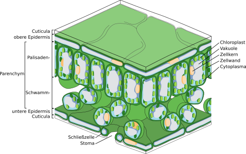 Die Cuticula der Pflanzen ist ein wachsartiger Überzug, der nur von Epidermiszellen[1] in Blättern, jungen Sprossen und anderen, der Luft ausgesetzten Geweben ohne Periderm gebildet wird. Durch ihre hydrophoben Eigenschaften verringert sie Wasserverluste; bei Pflanzen in trockenen Gebieten auf 0,01 % dessen, was eine gleich große, freie Wasseroberfläche abgeben würde. An Stellen, an denen jedoch Austausch nötig ist, kann die Cuticula auch porös oder rissig sein.[2] Die Rhizodermis weist gar keine Cuticula auf, um die Wasser- und Nährstoffaufnahme nicht zu behindern.