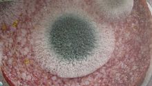 Schimmelpilze, sichtbar auch Schimmel genannt, sind in der Mikrobiologie eine systematisch heterogene Gruppe von filamentösen Pilzen, die in der Mehrzahl zu den taxonomischen Gruppen der Ascomyceten und Zygomyceten gehören.[1]
