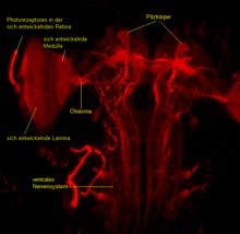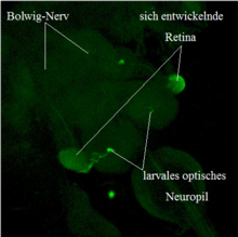 Während der Embryonalentwicklung kommt es im vorderen dorsalen Blastoderm zu einer plattenartigen Verdickung, welche invaginiert, sich in die Tiefe absenkt und sich zu sogenannten Plakoden ausbildet, die paarig vorliegen und sich lateral an die Oberfläche des sich entwickelnden Hirns als optische Anlagen anheften. Während der Larvenstadien nehmen die optischen Anlagen an Größe zu und transformieren sich, um in der Puppe zu den adulten optischen Loben auszudifferenzieren. Die optischen Anlagen spalten sich in die inneren und äußeren optischen Loben sowie in die adulte Retina. Aus den Anlagen der äußeren optischen Loben entwickeln sich zwei äußere optische Neuropile, die Lamina und Medulla. Die Anlagen für die inneren optischen Loben entwickeln sich in die Lobula und die Lobulaplatte. Bereits im zweiten Larvenstadium haben die sich entwickelnde Lamina und Medulla den Großteil des Volumens des Larvengehirns eingenommen. Während des dritten Larvenstadiums differenzieren sich die Lamina und Medulla weiter aus. Ebenfalls bilden sich die Verbindungen der inneren optischen Loben zum Zentralgehirn. An die Anlagen der optischen Loben angrenzend, befinden sich die Augen-Antennen-Imaginalscheiben, die sich aus undifferenzierten Stammzellen während der Embryogenese entwickeln. Während des dritten Larvenstadiums beginnt bereits eine Ausdifferenzierung, die in der Metamorphose bis zu vollständig differenzierten Komplexaugen weiterschreitet.[27][28] Das funktionelle Sehorgan der Larve ist das Bolwig-Organ. Es entsteht während der Embryonalentwicklung aus Vorläuferzellen, die sich von der optischen Invagination abspalten.[27] Das Bolwig-Organ besteht aus 12 Photorezeptorzellen mit den Rhodopsinen Rh5 und Rh6.[29] Rh5 absorbiert Licht im kurzwelligen blauen Bereich und gewährleistet die Lichtempfindlichkeit. Rh6 hingegen absorbiert langwelliges Licht und spielt zusätzlich eine wesentliche Rolle für die larvale innere Uhr.[30] Die Axone der Photorezeptoren bündeln sich und bilden den Bolwig-Nerv. Dieser projiziert durch die Augen-Antennen-Imaginalscheiben hindurch ins larvale Gehirn in das larvale optische Neuropil. Von dort aus folgen drei verschiedene Verschaltungen: auf serotonerge dendritisch verzweigte Neurone (SDA), auf dendritisch verzweigte ventrale laterale Neurone (LNvs) und auf visuelle Interneurone (CPLd).[31]
