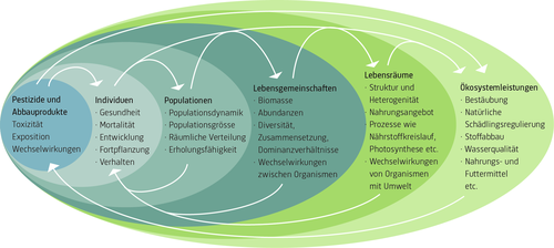 Der heutige Pestizideinsatz belastet vielerorts die Umwelt und beeinträchtigt die Biodiversität und die Ökosystemleistungen. Für die Biodiversität sind sowohl direkte Wirkungen relevant und wie auch indirekte, etwa über eine Reduktion des Nahrungsangebotes oder die Veränderung von Nahrungsnetzen. Beeinträchtigt werden deshalb nicht nur einzelne Individuen von Nicht-Zielorganismen, sondern ganze Populationen. Dies kann zum lokalen und regionalen Verschwinden von Arten führen. Ebenso können durch den Einsatz von Pestiziden auch Lebensgemeinschaften, Lebensräume und Ökosystemleistungen wie z. B. die Bestäubung oder Wasserqualität negativ beeinflusst werden. Pestizide stellen damit eine Gefahr für die Biodiversität dar.[16]