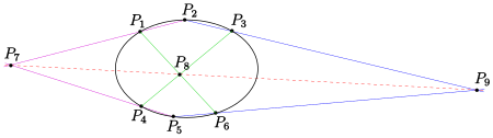 Seiten sei in einen Kegelschnitt einbeschrieben. Nun verlängert man die gegenüberliegenden Seiten, bis sie sich in