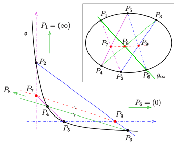 Im reellen Fall kann man den Beweis am Einheitskreis führen. Da ein nichtausgearteter Kegelschnitt über einem beliebigen Körper aber nicht immer als Einheitskreis darstellbar ist, wird hier die immer mögliche Darstellung des Kegelschnitts als Hyperbel benutzt.
