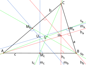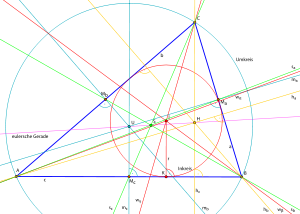 Die drei erstgenannten Schnittpunkte (H, U und S) liegen immer auf einer Geraden, der eulerschen Geraden. Auf ihr, und zwar in der Mitte zwischen H und U, liegt auch der Mittelpunkt des Feuerbachkreises.