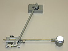Polarplanimeter, rechts der Fahrstift mit Lupe, links die Rolle mit Zählwerk, oben der während der Messung feste Pol