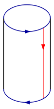 Man klebe die roten Pfeile des Quadrats zusammen (linke und rechte Kanten), so dass man einen Zylinder erhält. Man ziehe den Zylinder etwas auseinander und klebe weiterhin die Enden so zusammen, dass die Pfeile auf den Kreis passen. Dabei wird die Kreisfläche der einen Zylinderfläche durch die der anderen geschoben. Beachte, dass dieser Vorgang zur Überkreuzung von Kanten führt. Man bezeichnet dies als Immersion der Kleinschen Flasche im dreidimensionalen Raum.