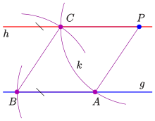 - Zu jeder Geraden und jedem Punkt, der nicht auf der Geraden liegt, gibt es genau eine Gerade, die zur gegebenen Geraden parallel ist und durch den gegebenen Punkt geht (die Parallele durch diesen Punkt).
