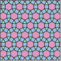 Die Zahlen unter den Abbildungen geben an, wie viele Ecken die regelmäßigen Polygone haben, die jeweils an einem Punkt zusammenstoßen. Die Innenwinkel ergeben zusammen 360°.