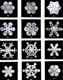 - Kristallstrukturen: Viele Kristalle bilden hexagonale Formen aus. Bekannte Beispiele sind natürliches (Wasser-)Eis und sechsstrahlige Schneeflocken, da beim Wassermolekül die Wasserstoffatome ebenfalls annähernd einen 120° Winkel zum Sauerstoff bilden.