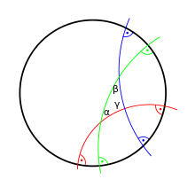 - Die hyperbolische Winkelmessung entspricht der euklidischen Winkelmessung, wobei der Winkel zwischen zwei Kreisbögen über deren Tangenten am Schnittpunkt bestimmt wird.