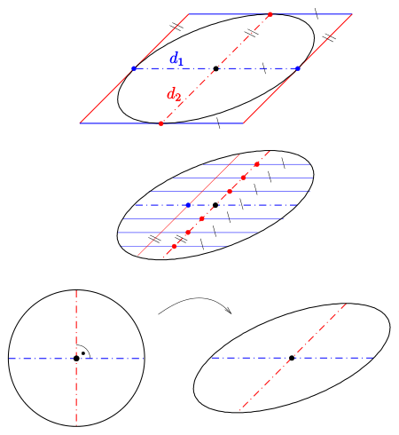 - KD3: Fasst man eine Ellipse als affines Bild des Einheitskreises auf, so heißen die Bilder orthogonaler Kreisdurchmesser konjugiert.