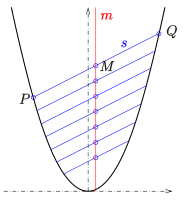 - Die Mittelpunkte paralleler Sehnen einer Parabel liegen auch auf einer Gerade. Diese Gerade ist immer parallel zur Parabelachse (s. Bild). Da eine Parabel keinen Mittelpunkt besitzt, spricht man hier i.a. nicht von konjugierten Durchmessern. Manchmal wird eine Parallele zur Parabelachse als Durchmesser bezeichnet.