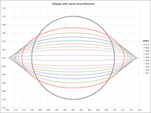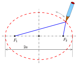 Ellipsen sind in der Geometrie spezielle geschlossene ovale Kurven. Sie zählen neben den Parabeln und den Hyperbeln zu den Kegelschnitten. Eine anschauliche Definition verwendet die Eigenschaft, dass die Summe der Abstände eines Ellipsenpunktes von zwei vorgegebenen Punkten, den Brennpunkten, für alle Punkte gleich ist. Sind die Brennpunkte identisch, erhält man einen Kreis.