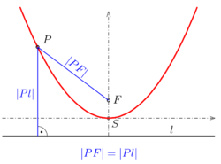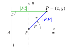 Ist der Punkt F der Nullpunkt und hat die Gerade l die Gleichung {\displaystyle x=-d}, so gilt in Polarkoordinaten (s. Bild):