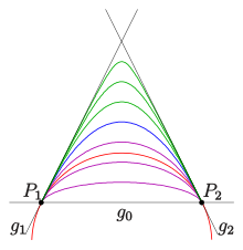 mit dem Scharparameter \mu ein Büschel von Kegelschnitten durch die beiden Punkte {\displaystyle P_{1}=g_{0}\cap g_{1}} und {\displaystyle P_{2}=g_{0}\cap g_{2}}. Jeder Kegelschnitt berührt die beiden Geraden {\displaystyle g_{1},g_{2}} in diesen Punkten. Das Kegelschnittbüschel ist also durch die beiden Punkte P_1, P_2 und die beiden Tangenten {\displaystyle g_{1},g_{2}} in diesen Punkten bestimmt. (Ein Kegelschnitt ist immer durch 5 Vorgaben eindeutig bestimmt!) Beide Kegelschnitte, mit der die Linearkombination gebildet wird, sind ausgeartete Kegelschnitte ({\displaystyle f_{1}f_{2}=0} ist ein Geradenpaar und {\displaystyle f_{0}^{2}=0} ist eine Doppelgerade).