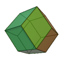 Das Rhombendodekaeder ist ein Polyeder mit zwölf rhombenförmigen Flächen, 14 Ecken und 24 Kanten. An sechs der Ecken grenzen vier Kanten und an die übrigen acht Ecken grenzen drei Kanten.