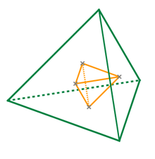 Durch Verbinden der Flächenmittelpunkte erhält man wieder ein Tetraeder. Man sagt deshalb: Das Tetraeder ist zu sich selbst dual, kurz: selbst-dual. Die Seitenlänge des neuen Tetraeders beträgt ein Drittel der ursprünglichen Seitenlänge.