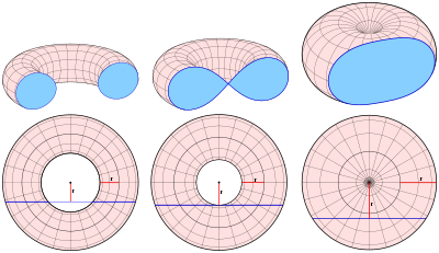 - schneidende Ebene parallel zur Torusachse und der Abstand von der Torusachse gleich dem Radius des erzeugenden Kreises ist (s. Bild).