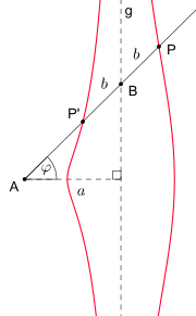 - Die Punkte der Konchoide des Nikomedes sind gekennzeichnet durch die folgende geometrische Eigenschaft: Gegeben seien eine Gerade g ("Leitgerade"), ein Punkt A, der von g den Abstand a hat (mit a > 0), und eine reelle Zahl b (mit b > 0). Dann liegen für einen beliebigen Punkt B der Geraden g die beiden Punkte P und P', die auf der Geraden AB liegen und von B die Entfernung b haben, auf der Konchoide.