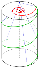 durch eine Hyperbel beschrieben. Sie entsteht bei der Zentralprojektion einer Schraubenlinie