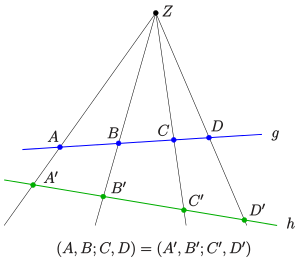 - Das Doppelverhältnis bleibt bei einer Zentralprojektion invariant. (s. Bild)