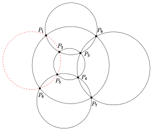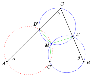 Der Satz von Miquel, benannt nach Auguste Miquel, macht eine Aussage über Schnittpunkte von drei Kreisen durch jeweils eine Ecke eines Dreiecks in der reellen Ebene (s. Bild):
