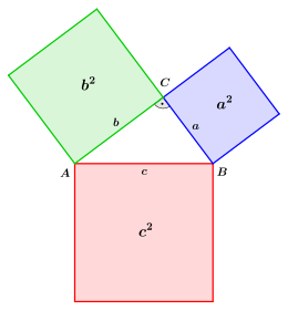 In geometrischer Deutung ist demnach in einem rechtwinkligen Dreieck die Summe der Flächen der beiden Quadrate über den Katheten gleich der Fläche des Quadrats über der Hypotenuse.