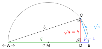 somit ist die Seitenlänge b des rechtwinkligen Dreiecks ABC gleich der Quadratwurzel aus {\displaystyle q.}