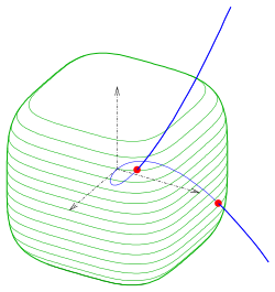 - Die Schnittpunkte sind: (−0,8587; 0,7374; −0,6332), (0,8587; 0,7374; 0,6332).