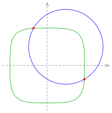- Als Schnittpunkte ergeben sich (−0.3686; 0,9953) und (0,9953; −0,3686).
