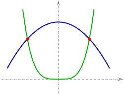 - Die Schnittpunkte sind: (−1,1073; −1.3578) und (1,6011; 4,1046)