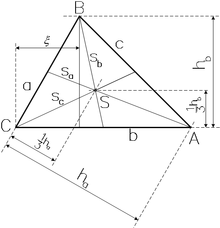Die Seitenhalbierenden eines Dreiecks sind Schwerelinien des Dreiecks. Sein Schwerpunkt liegt im gemeinsamen Schnittpunkt der drei Seitenhalbierenden. Er teilt diese im Verhältnis 2:1, wobei die längere der beiden Teilstrecken die Strecke vom Schwerpunkt zum Eckpunkt ist.