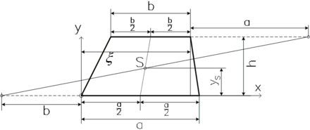 Der Schwerpunkt des Trapezes lässt sich folgendermaßen konstruieren: Eine Schwerelinie halbiert die beiden parallelen Seiten. Eine zweite erhält man, indem man die parallelen Seiten um die Länge der jeweils anderen in entgegengesetzten Richtungen verlängert, und die beiden Endpunkte miteinander verbindet. Die Formel in kartesischen Koordinaten lautet (gemessen vom linken unteren Eckpunkt):