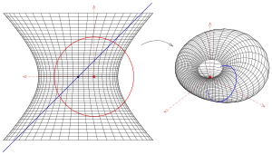 Auf einem einschaligen Rotationshyperboloid liegt eine Schar von Kreisen (im Bild sind es horizontale Kreise) und zwei Scharen von Geraden (im Bild ist eine Gerade (blau) dargestellt). Die Kreise gehen wieder in eine die Fläche überdeckende Schar von Kreisen über. Auch jede Gerade (Erzeugende) des Hyperboloids geht in einen Kreis durch den Ursprung über (s. Bild). Die Schar von Hyperbeln (sie schneiden die Kreise orthogonal) wird auf eine Schar von Lemniskaten-ähnlichen Kurven, die den Ursprung enthalten, abgebildet. Im Bild sind nur diese Teile dieser Kurven dargestellt, die sich als Bilder der Hyperbelbögen ergeben.