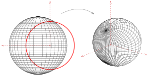 Die für eine Inversion einfachste Fläche ist eine Kugel mit Längen- und Breitenkreisen. Das Bild der Kugel ist wieder eine Kugel und die Längen- und Breitenkreise gehen wieder in ein System von sich orthogonal schneidenden Kreisen über. Die Bilder von Nord- und Südpol liegen allerdings im Allgemeinen nicht mehr auf einem Kugeldurchmesser (siehe Bild).
