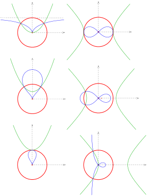 b) Die Parabel y=x^2-\tfrac{1}{4} wird durch die Kreisspiegelung auf die Kardioide mit der Gleichung (x^2+y^2+2y)^2=4(x^2+y^2) abgebildet. Die Inversion einer Parabel ergibt nur dann eine Kardioide, wenn das Inversionszentrum im Brennpunkt liegt.