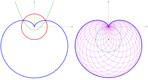 Bei der Inversion einer Parabel gehen die Tangenten in eine Schar von Kreisen durch den Nullpunkt über, deren Einhüllende die Bildkurve ist. Im Fall der Kardioide liegen die Mittelpunkte dieser Kreise auch auf einem Kreis durch den Nullpunkt (in Beispiel b) hat dieser Kreis den Radius 1). Diese Eigenschaft verwendet man, um eine Kardioide als Einhüllende von Kreisen zu zeichnen: 1) Wähle einen Kreis k und einen Punkt O darauf, 2) Zeichne Kreise durch O mit Mittelpunkte auf k, 3) Zeichne die Einhüllende dieser Kreise.