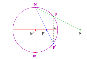 so wird die Spiegelung am Einheitskreis als Abbildung auf der Riemannschen Zahlenkugel durch die gewöhnliche Spiegelung an der Äquatorebene vermittelt (siehe Bild). Dabei wird der Punkt N mit dem Punkt m vertauscht und Kreise durch N gehen in Kreise durch m über. Kreise durch N = \infty entsprechen im ebenen Modell Geraden.