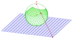 Bei der Stereografischen Projektion projiziert man die Punkte einer Kugel von einem Kugelpunkt N aus auf die Tangentialebene des gegenüber liegenden Punktes S (s. Bild). Diese Abbildung lässt sich als Inversion einer Kugel auf eine Ebene auffassen. Hat die Kugel, die abgebildet wird, die Gleichung x^2+y^2+(z+\tfrac{1}{2})^2=\tfrac{1}{4} (Mittelpunkt {\displaystyle (0,0,-0{,}5)}, Radius 0{,}5, im Bild grün), so wird sie bei der Inversion an der Einheitskugel (im Bild rot) auf die Tangentialebene im Punkt S=(0,0,-1) abgebildet. Die Geraden durch das Inversionszentrum N werden auf sich abgebildet. Sie sind die Projektionsstrahlen der Stereografischen Projektion. Die im Bild sichtbaren Längenkreise der Kugel werden auf Geraden (der Tangentialebene im Südpol S) durch S abgebildet. Die Breitenkreise gehen in konzentrische Kreise mit Mittelpunkt S über.