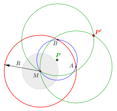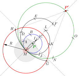 , wobei die Inversion am neuen Kreis durchgeführt wird. Zuletzt verdoppelt man den Abstand des Bildpunktes doppelt so oft wie man den Radius halbiert hat. (Auch dies ist mit Zirkel allein möglich.) Dieser Punkt ist der gesuchte Bildpunkt.