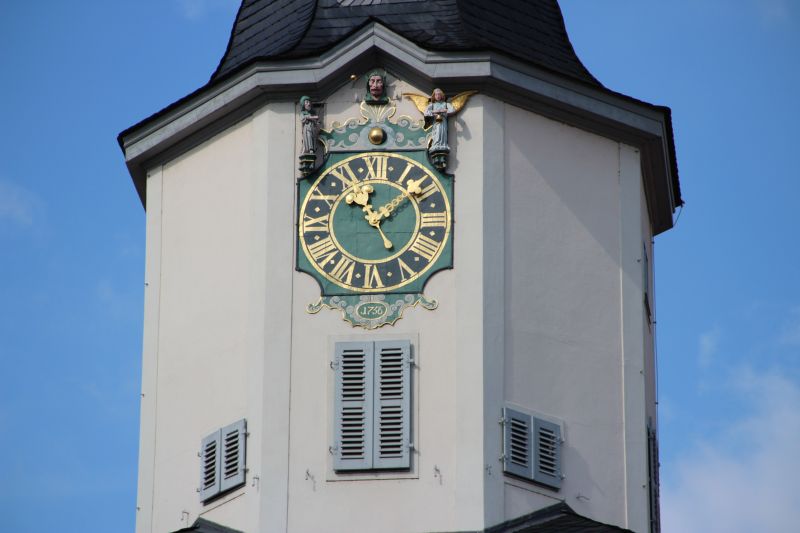 ![]() Das Ergebnis einer „Haupt-Reperatur“ des Hauses im Jahre 1755 war die Errichtung des barocken Mittelturmes mit einer Kunstuhr. Die am Turm erwähnte Kunstuhr mit dem Figurenspiel des „Schnapphans“ zählte zu den sog. sieben Wundem Jenas. Über dem Zifferblatt reißt der „Hans von Jene“ seinen breiten Mund auf und schnappt stündlich nach einer ihm von einem Pilger hingehaltenen Kugel, während viertelstündlich der rechts stehende Engel ein Glöckchen läutet. Lediglich der Narrenkopf wird bereits seit dem 16. Jh. erwähnt, die übrigen Figuren hatten ursprünglich andere Funktionen und entstammen verschiedenen Schnitzwerkstätten. Alle Skulpturen sind Kopien; die Originale werden im Stadtmuseum aufbewahrt. |