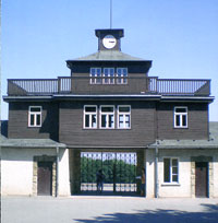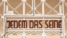 Eingangstor mit dem Spruch „Jedem das Seine“ – eine Schrift im von den Nazis verfemten Bauhausstil, gestaltet durch den Häftling und Bauhausschüler Franz Ehrlich