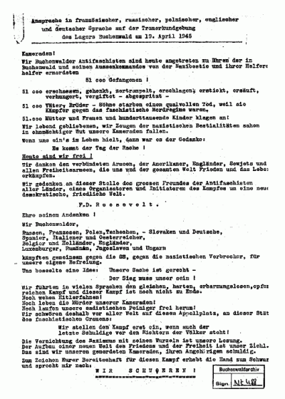 Internationale Trauerfeier für die Toten des Lagers. Die überlebenden geben sich ein Versprechen, das später als "Schwur von Buchenwald" bekannt wird.