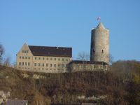 Von der 1166 genannten markgräflichen Burg an der östlichen Flußseite kündet der mächtige Rundturm, dessen Mauertechnik in das späte 12. oder in das frühe 13. Jh. weist. Ein massiver Kegelhelm bekrönt den wehrhaften Bau. Die Burg wird 1451 zum Ende des sächsischen Bruderkrieges belagert, gestürmt und durch Feuer vernichtet.