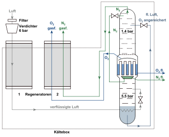 Die eigentliche Trennung von Stickstoff und Sauerstoff erfolgt durch Destillation in zwei Rektifikationskolonnen mit unterschiedlichen Drücken. Die Destillation erfolgt dabei im Gegenstromprinzip, das heißt durch die Kondensationswärme verdampftes Gas strömt nach oben, kondensierte Flüssigkeit tropft nach unten. Da Sauerstoff einen höheren Siedepunkt als Stickstoff besitzt, kondensiert er leichter und sammelt sich so am Boden, Stickstoff am Kopf der Kolonne. Die Trennung erfolgt zunächst bei 5-6 bar in der sogenannten Mitteldruckkolonne Die dabei entstehende sauerstoffangereicherte Flüssigkeit wird anschließend in der Niederdruckkolonne (Druck etwa 0,5 bar) weiter getrennt. Durch den flüssigen Sauerstoff der Niederdruckkolonne wird gasförmiger Stickstoff der Hochdruckkolonne geleitet. Dabei verflüssigt sich dieser und erwärmt mit der abgegebenen Kondensationswärme die Flüssigkeit. Der leichter flüchtige Stickstoff wird bevorzugt abgegeben und es bleibt gereinigter flüssiger Sauerstoff zurück. Dieser enthält noch die Edelgase Krypton und Xenon, die in einer separaten Kolonne abgetrennt werden.