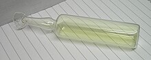 Chlor ist bei Raumtemperatur ein gelbgrünes Gas, das mit einer Dichte von 3,214 g/l bei 0 °C etwa 2,5 mal so schwer wie Luft ist. Es kondensiert bei −34,6 °C zu einer gelben Flüssigkeit und erstarrt bei −101 °C.[40] Da der kritische Punkt mit 143,9 °C, 77,1 bar und 0,67 g/cm³ relativ hoch ist, lässt sich Chlor leicht unter Druck verflüssigen. So ist es bei einem Druck von 6,7 bar bei 20 °C flüssig und lässt sich in Stahlflaschen oder Kesselwagen transportieren.[40] Die Intensität der Farbe nimmt bei geringerer Temperatur ab, bei −195 °C ist Chlor fast farblos.[41]